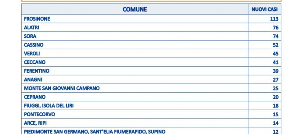 Altri Comuni con nuovi casi: 4 ARNARA ATINA BROCCOSTELLA CASALVIERI CASTROCIELO FUMONE PESCOSOLIDO SAN DONATO VAL DI COMINO SAN GIOVANNI INCARICO SANTOPADRE TORRE CAJETANI; 3 AUSONIA CASTRO DEI VOLSCI CERVARO FONTECHIARI GIULIANO DI ROMA PIGNATARO INTERAMNA; 2 CAMPOLI APPENNINO CASTELNUOVO PARANO PICINISCO PICO SAN VITTORE DEL LAZIO SANT’APOLLINARE 2 SERRONE SGURGOLA TREVI NEL LAZIO TRIVIGLIANO VALLECORSA VICO NEL LAZIO VILLA LATINA; 1 ACUTO BELMONTE CASTELLO COLLE SAN MAGNO COLLEPARDO FALVATERRA FONTANA LIRI GALLINARO GUARCINO POSTA FIBRENO SETTEFRATI TERELLE VALLEMAIO VALLEROTONDA VILLA SANTO STEFANO