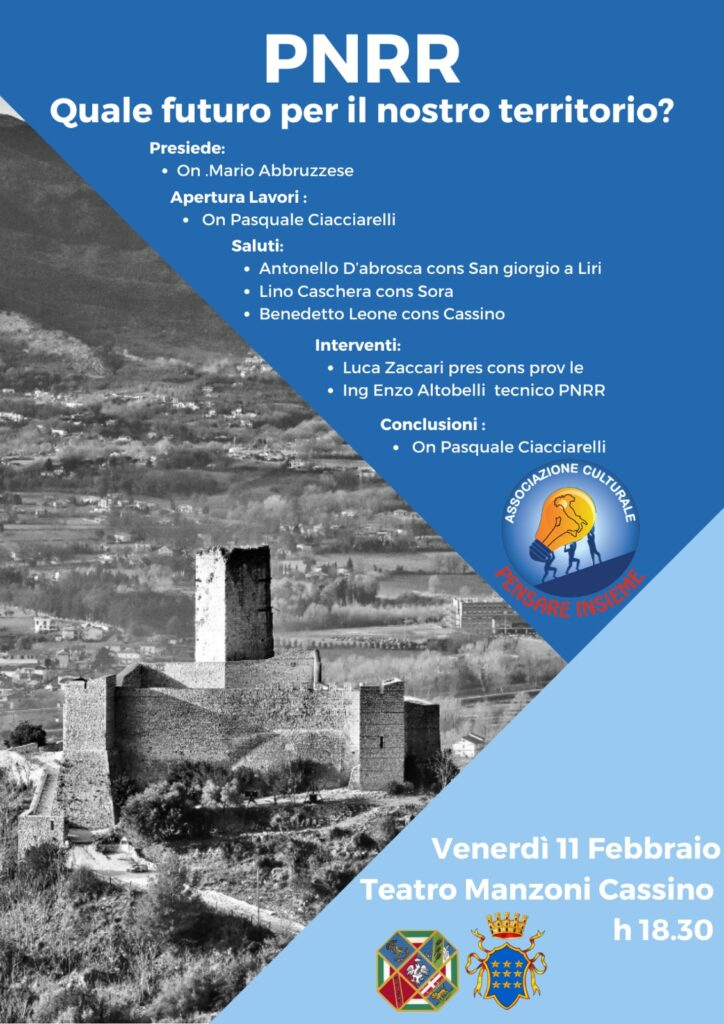 Una giornata di dibattito, spunti e idee per affrontare la sfida più grande di questi tempi: il Pnrr o piano nazionale di ripresa e resilienza, che porterà in dote fondi per disegnare il futuro di imprese e Comuni. Se ne parlerà nel corso del convegno, ‘Pnrr, Quale futuro per il nostro territorio?, che si terrà venerdì 11 febbraio, all’interno del teatro Manzoni di Cassino. Ad organizzalo l’assocazione culturale ‘Pensare Insieme’. A presiedere il dibattito sarà Mario Abbruzzese. Previsti i saluti dei consiglieri comunali di San Giorgio a Liri, Sora e Cassino, Antonello D’Abrosca, Lino Caschera e Benedetto Leone. In programma gli interventi di Luca Zaccari, presidente del consiglio provinciale di Frosinone, e dell’ingegner Enzo Altobelli, ceo di Profima, ed esperto di Pnrr. Le conclusioni saranno affidate a Pasquale Ciacciarelli, consigliere regionale della Lega.