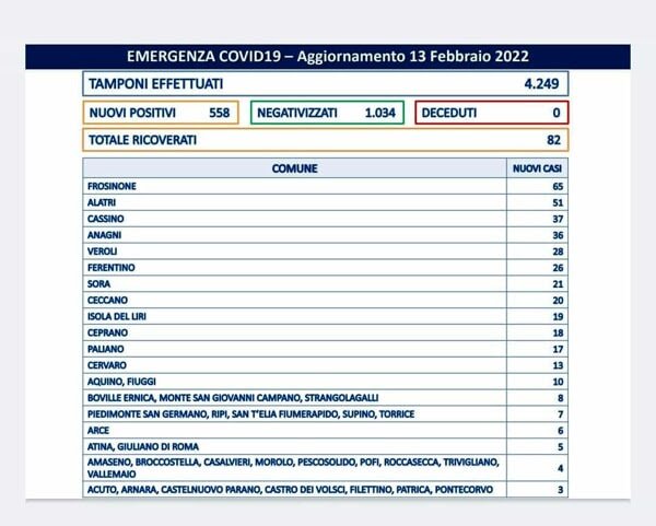 I Ciociaria si registrano 0 decessi (come ieri) 558 nuovi casi positivi (+18) e 1.034 guariti a fronte di 4.249 tamponi effettuati (+649). I ricoverati sono 82 (+1). Il Comune con il maggior numeri di contagi è il Capoluogo: 65 (vedi tabella in basso).