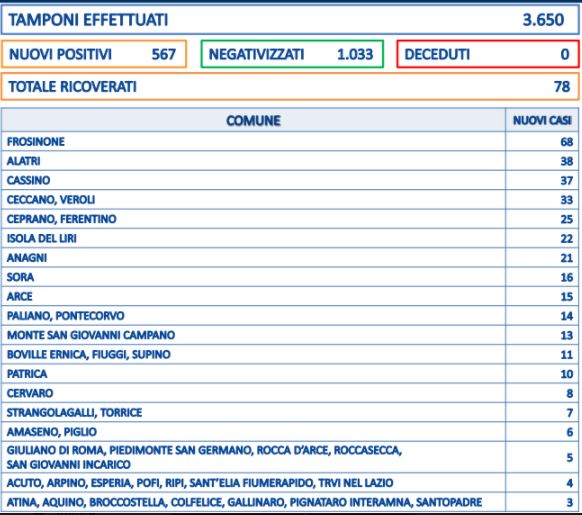 Nelle ultime 24 ore, come specificato nel quotidiano bollettino della Asl, risultano infatti 567 nuovi casi (in diminuzione da diversi giorni) a fronte di 3.650 tamponi. Nessun decesso è stato segnalato anche oggi, mentre i guariti sono 1.033, quasi il doppio dei nuovi contagi. Diminuiscono sensibilmente anche gli “attualmente ricoverati”, che da 83 passano a 78.