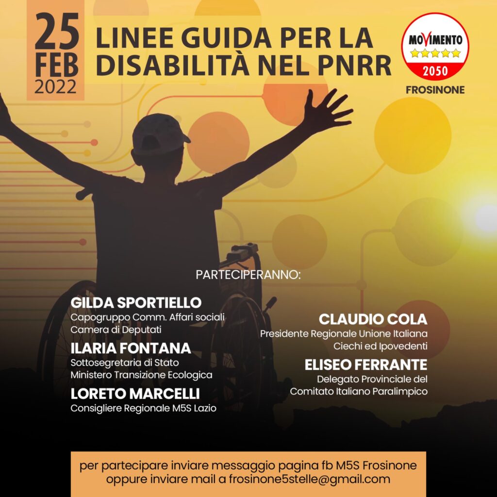 Il Movimento 5 Stelle frusinate prosegue il lavoro di approfondimento tematico su materie di interesse sociale e attualità politica attraverso eventi pubblici on line, dopo aver parlato dei temi di agricoltura e turismo con ospiti nazionali e regionali, per questo venerdi 25 febbraio dalle ore 21 organizza una videoconferenza incentrata sulle “linee guida per la disabilità incluse nel Pnrr”. Ospite per l’occasione oltre alla Sottosegretaria di Stato al Mite Ilaria Fontana, la capogruppo camera m5s della commissione affari sociali on. Gilda Sportiello il capogruppo regionale Loreto Marcelli e i rappresentanti regionali e provinciali dell’associazione nazionale ciechi e ipovedenti e del comitato paralimpico. Il format aperto a tutti, prevede la possibilità di interagire live. Per poter partecipare, sarà necessario registrarsi al link che verrà reso disponibile sulla pagina facebook movimento 5 stelle frosinone, o su richiesta tramite mail a frosinone5stelle@gmail.com