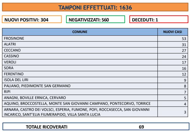 Sono 304, a fronte di 1.636 tamponi, i nuovi casi di Covid in Ciociaria. I guariti sono 560 mentre gli “attualmente ricoverati” sono 69. Purtroppo, si registra il decesso di una donna di 82 anni residente a Ceccano, con patologie pregresse