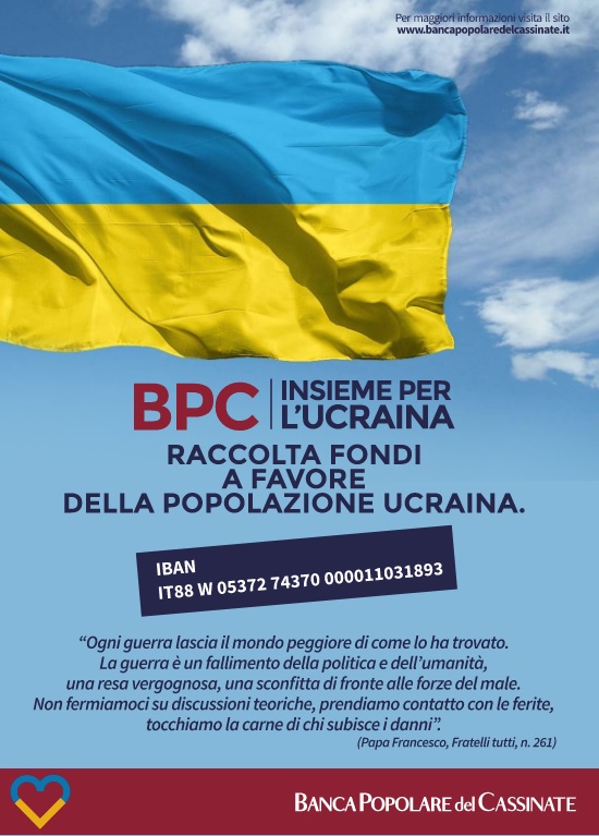 E’ con questo spirito che la Banca Popolare del Cassinate ha voluto unire la propria voce e il proprio impegno al coro delle tantissime iniziative con le quali, in questi giorni, tanti si stanno attivando per sostenere le popolazioni colpite dalla guerra.