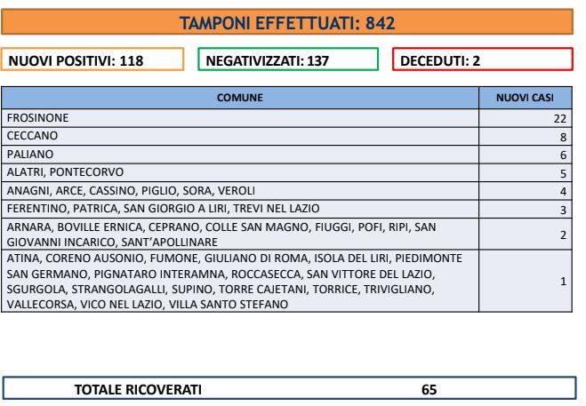 Nel bollettino quotidiano della Asl figurano 118 nuovi casi di Covid, mentre i guariti sono solo 137 e gli “attualmente ricoverati” sempre 65. Purtroppo, si registrano due decessi: un uomo di 84 anni di Castrocielo e un uomo di 89 di Ferentino, entrambi con patologie pregresse.