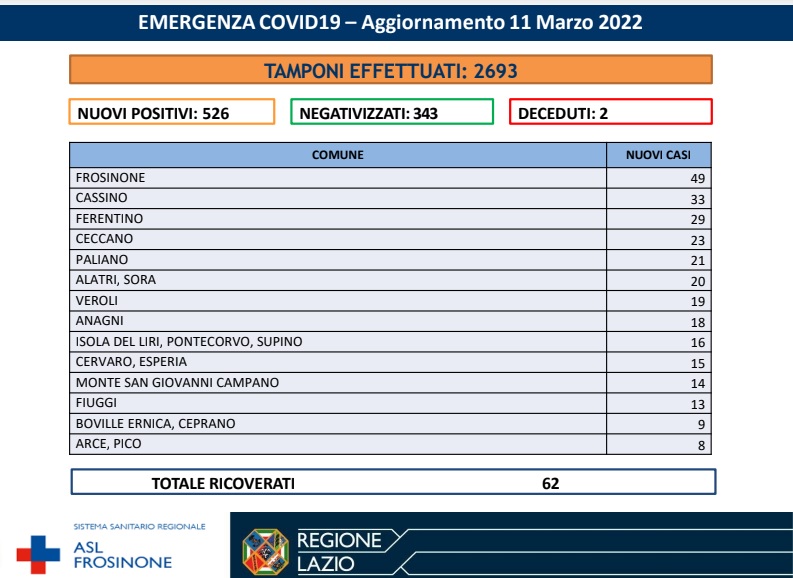 Altri due decessi in provincia di Frosinone, a causa del Covid. Si tratta di una donna di 79 anni di Castrocielo e un uomo di 86 anni di Ferentino con patologie pregresse. I nuovi casi ammontano a 526, mentre le persone guarite risultano essere 343. “Dopo un periodo in cui si è osservato un andamento favorevole della curva epidemica COVID-19 con sensibile diminuzione dei casi giornalieri e un graduale miglioramento di tutti gli indicatori correlati, nell’ultima settimana in tutto il Paese è stato rilevato un sensibile aumento dei nuovi contagi dovuto, almeno in parte, alle varie feste del periodo di carnevale”. Lo evidenzia la Asl di Frosinone- “Corre quindi l’obbligo di rammentare a tutta la popolazione la necessità di continuare ad adottare tutte le precauzioni possibili per ridurre le occasioni di contagio da COVID-19 ad iniziare dall’uso delle mascherine al chiuso, peraltro ancora obbligatorio. L’uso delle mascherine all’aperto va adottato ogni qualvolta non sia possibile rispettare le distanze minime di sicurezza dalle altre persone e rimane comunque consigliato in ogni caso. Si raccomanda di evitare, quando possibile, ogni situazione di assembramento tenendo sempre presente che il distanziamento sociale continua ad essere una misura precauzionale efficace nell’interrompere la trasmissione del virus da soggetto a soggetto. È sempre valido il consiglio di igienizzare frequentemente le mani, di fare attenzione alla comparsa di sintomatologia specifica (tosse, febbre, rinite, ecc) e, nel caso, di rivolgersi prontamente al proprio medico curante per consigli sulle misure da adottare”.