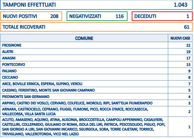 Sono 1.043 i tamponi effettuati per un totale di 208 nuovi positivi. I guariti, invece, ammontano a 116. Si registra l’ennesimo decesso: si tratta di un uomo di 75 anni residente a Monte San Giovanni Campano con pregresse patologie, ed è il decimo morto per Covid in soli 6 giorni. Crescono gli “attualmente ricoverati”, che dai 59 di ieri risalgono a quota 61.