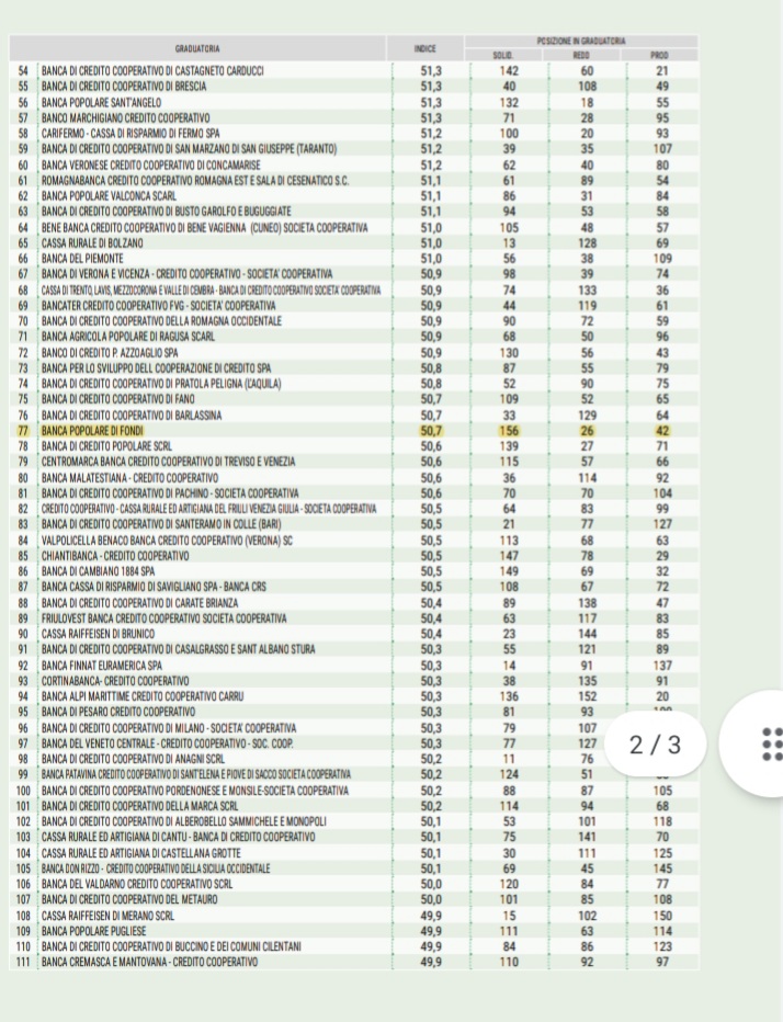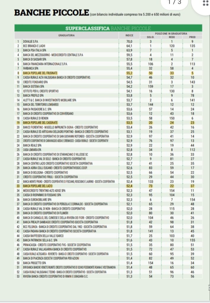 Prima popolare nel Lazio, prima popolare in Italia e ottavo posto in assoluto in Italia. Non stiamo dando i numeri, ma evidenziando lo straordinario risultato della Banca Popolare del Frusinate nella speciale classifica pubblicata nel mese di marzo su “BancaFinanza”. La classifica parla chiaro, con la Banca Popolare del Frusinate all’ottavo posto assoluto nella classifica delle piccole Banche, con bilancio individuale compreso tra 5.200 e 650 milioni di euro. La prima, a titolo di cronaca, è la Dovalue Spa. Nel Lazio, prima fra le piccole, con la Popolare del Cassinate al 19esimo posto, la Banca Popolare del Lazio al 33esimo e la Banca Popolare di Fondi al 77esimo.