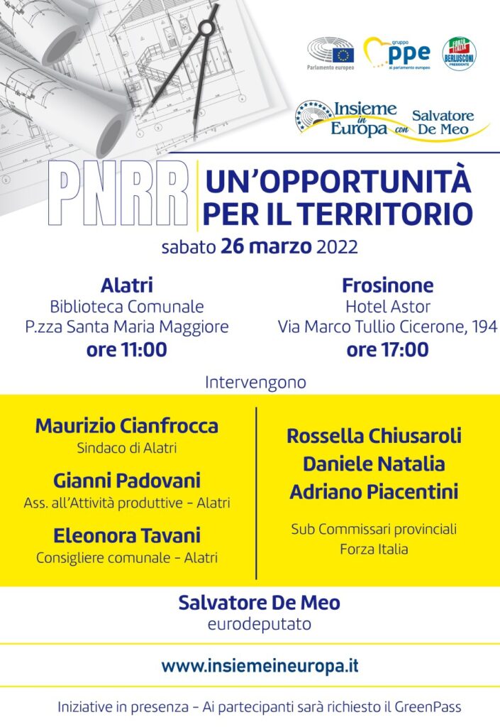Il coordinamento provinciale di Forza Italia Frosinone ha organizzato una serie di incontri tematici che si terranno in provincia nei prossimi mesi per incontrare cittadini ed imprese ed illustrare le opportunità per il territorio rappresentate dal PNRR oltre ad affrontare temi di attualità politica di interesse della provincia. I primi due i si terranno sabato 26 marzo ad Alatri e a Frosinone dove interverranno amministratori locali, i sub commissari Daniele Natalia, Adriano Piacentini e Rossella Chiusaroli e l’eurodeputato Salvatore De Meo che presenterà anche la sua piattaforma “Insieme in Europa”, appositamente realizzata per informare cittadini, imprese ed Enti locali sui vari finanziamenti europei, nazionali e regionali.