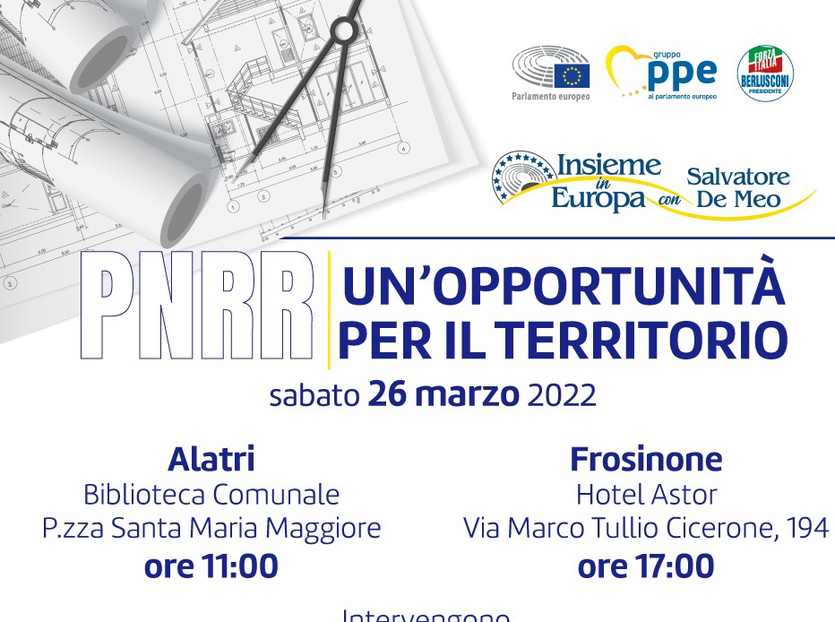 Il coordinamento provinciale di Forza Italia Frosinone ha organizzato una serie di incontri tematici che si terranno in provincia nei prossimi mesi per incontrare cittadini ed imprese ed illustrare le opportunità per il territorio rappresentate dal PNRR oltre ad affrontare temi di attualità politica di interesse della provincia. I primi due i si terranno sabato 26 marzo ad Alatri e a Frosinone dove interverranno amministratori locali, i sub commissari Daniele Natalia, Adriano Piacentini e Rossella Chiusaroli e l’eurodeputato Salvatore De Meo che presenterà anche la sua piattaforma “Insieme in Europa”, appositamente realizzata per informare cittadini, imprese ed Enti locali sui vari finanziamenti europei, nazionali e regionali.
