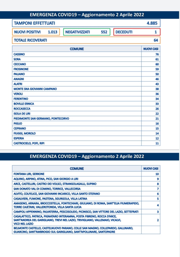 Un decesso e 1013 nuovi casi. Il covid continua a mietere vittime anche in provincia di Frosinone. A perdere la vita una donna di 87 anni residente a Torrice con pregresse patologie. Le persone guarite nelle ultime 24 ore sino 552, mentre I ricoverati ammontano a 64