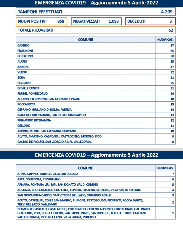 Tre decessi e altri 858 positivi. Il Covid in provincia di Frosinone non arresta la sua corsa. A perdere la vita un uomo di 81 anni di Frosinone, una donna di 91 anni di Arce e un uomo di 81 anni di San Vittore del Lazio con patologie pregresse. Le persone guarite ammontano a 1093.