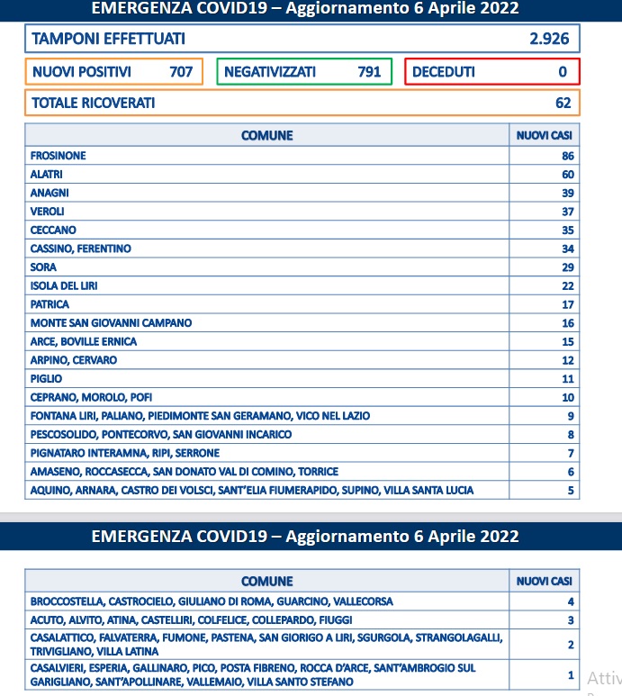Prosegue senza sosta la corsa del covid in provincia di Frosinone. Nelle ultime 24 ore sono stati registrati altri 707 positivi, su un totale di 2926 tamponi processati. I guariti ammontano a 791 mentre le persone ricoverate sono 62. Per fortuna non si registrano decessi.