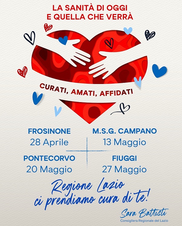 In occasione della giornata mondiale della salute, la Presidente della Commissione regionale Affari Costituzionali del Lazio, Sara Battisti, annuncia l’iniziativa “La Regione Lazio si prende cura di te”, quattro eventi sulla “sanità di oggi e quella che verrà”: il 28 aprile a Frosinone, il 13 maggio a Monte San Giovanni Campano, il 20 maggio a Pontecorvo e il 27 maggio a Fiuggi.