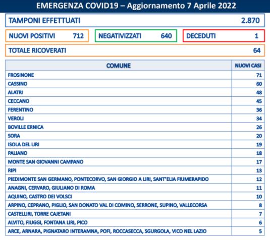 Sono 712 i nuovi casi di covid in provincia di Frosinone. Registrato il decesso di una donna di 90 anni residente a Castro dei Volsci con pregresse patologie. I negativizzati ammontano a 640 e gli “attualmente ricoverati” ancora a quota 64.