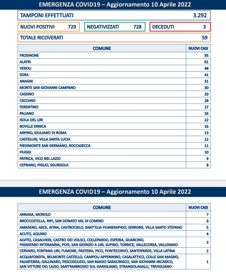 Su 3.292 tamponi effettuati sono stati 729 i nuovi casi di Covid che si sono registrati in provincia di Frosinone nelle ultime 24 ore, a fronte di 728 negativizzati.