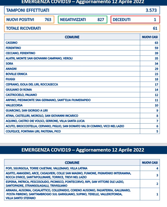 Tornano a salire i casi di covid in provincia di Frosinone. Nelle ultime 24 ore sono stati registrati 763 nuovi positivi. Putroppo si registra anche un decesso. A perdere la vita una donna di 82 anni di Isola del Liri con pregresse patologie.