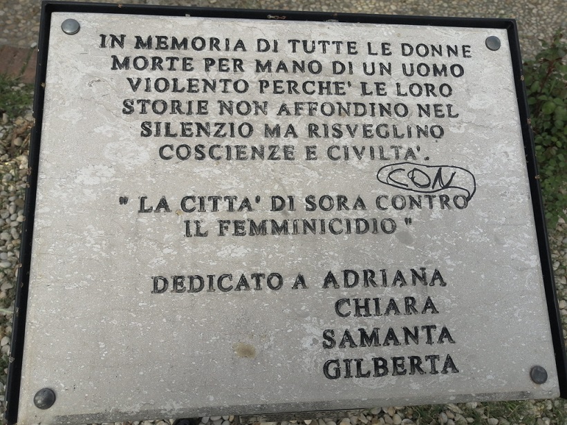 Esecrabile atto vandalico ai danni del monumento installato dal 2015 nel parco Santa Chiara di Sora: la targa in memoria di donne strappate alla vita da mano violente è stata imbrattata con una scritta che inneggia al femminicidio.
