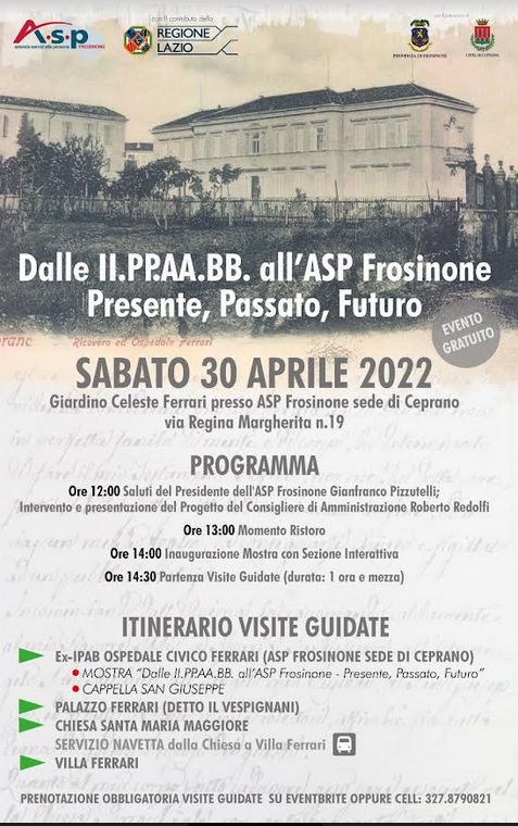 “L’evento culturale “Dalle II.PP.AA.BB. all’ASP Frosinone – Presente, Passato, Futuro” costituisce un’occasione per riscoprire lo storia importante, in molti casi secolare, degli ex Istituti Pubblici di Assistenza e Beneficenza della Provincia di Frosinone prima che queste confluissero nel sistema ASP Frosinone.  Lo evidenzia Gianfranco Pizzutelli, presidente dell’ente. “Uno storia che si intreccia inevitabilmente con lo sviluppo economico, sociale e culturale del territorio in cui le II.PP.AA.BB. sono note ed hanno operato”.L’appuntamento è per sabato a Ceprano in via Regina Margherira nella sede Asp. Alle 14 l’inaugurazione della mostra, alle 14,30 il via alle visite guidate all’ex ospedale, a palazzo ferrari, alla chiesa di Santa Maria Maggiore eda Villa Ferrari. La mostra temporanea nei locali della sede ASP Frosinone di Ceprano (ex Ospedale Ferrari – Viale Regina Margherita n. 19), ha lo scopo  di esporre il materiale di particolare rilievo storico artistico conservato nelle sede dell’Ente, dando quindi la possibilità al pubblico di conoscere la storia, i documenti. Le visite potranno essere prenotate tramite al link https://www.eventbrite.com/e/biglietti-dalle-iippaabb-allasp-frosinone-presente-passato-futuro-328065401447 oppure al numero +39 3278790821.
