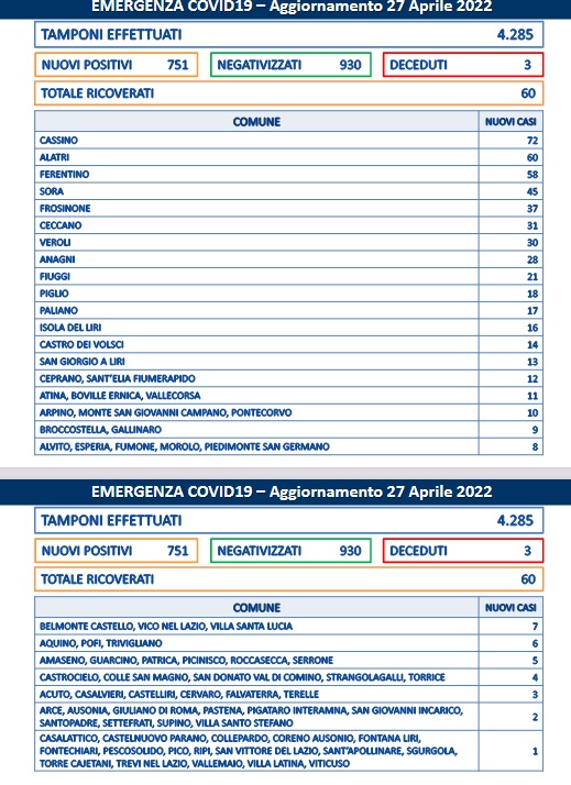 Il covid continua a mietere vittime in provincia di Frosinone. A perdere la vita nelle ultime 24 ore: un uomo di 71 anni residente a Villa Latina, una donna di 75 anni residente a Ceprano e un’altra donna di 91 residente a Castro dei Volsci, tutti con pregresse patologie. Risale anche la curva dei contagi: sempre nelle ultime 24 ore ne sono stati registrati 751. I guariti ammontano, invece, a 930. Ancora 60 le persone ricoverate. Da lunedì ad oggi sono 8 le persone decedute.