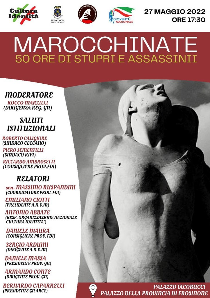 Marocchinate: 50 ore di stupri ed assassinii”. È questo il forte titolo della conferenza che si terrà oggi, venerdì 27 maggio alle 17:30, presso il palazzo provinciale. L’evento, organizzato in sinergia da Gioventù Nazionale, A.N.V.M. e CulturaIdentità ha lo scopo di far luce su una pagina di storia tragica e molto sentita dalla popolazione della provincia di Frosinone. Furono infatti migliaia le violenze perpetrate contro uomini, donne e bambini da parte delle truppe coloniali Francesi. “Come ogni anno ci impegniamo per far si che la memoria delle vittime di questa barbarie venga onorota” – spiegano gli organizzatori- “con questo convegno vogliamo lanciare un chiaro segnale contro tutti gli oscurantismi: ancora oggi c’è chi ricorda e non smetterà di farlo”.