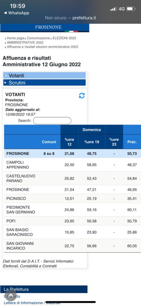 Urne aperte fino alle 23. In provincia di Frosinone gli elettori sono chiamati al rinnovo dei sindaci e dei consiglieri comunali in otto comuni.. L’affluenza alle urne alle 19 è del 48, 75%. Nella precedente tornata si era attestato al 50,73%. Nella tabella tutti i dati.