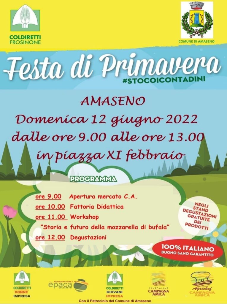 Si è tenuta ad Amaseno la “Festa di Primavera”, organizzata da Coldiretti Frosinone e patrocinata dal Comune di Amaseno. Nella mattinata sono stati coinvolti i bambini del Paese in attività inerenti la “fattoria didattica”, ai quali sono stati offerti degli zainetti con materiale didattico e diversi gadget. Inoltre, come di consueto, si è svolto il Mercato di Campagna Amica con numerose aziende della provincia. Nella stessa piazza è stato allestito un Workshop dal tema “Storia e futuro della mozzarella di bufala”. Ad aprire l’incontro è stato il Presidente di Coldiretti Frosinone Vinicio Savone, mentre il Sindaco di Amaseno, Antonio Como, è intervenuto ringraziando Coldiretti per il lavoro svolto sul territorio e complimentandosi con la segretaria di zona, Valeria Bianchi, per l’ottima organizzazione della giornata. Sono intervenuti sull’argomento il dott. Giovanni Turriziani, l’agronomo di Coldiretti Frosinone, dott. Simone D’Ambrosio, ed il consigliere di Anasb Davide De Prosperis. A moderare