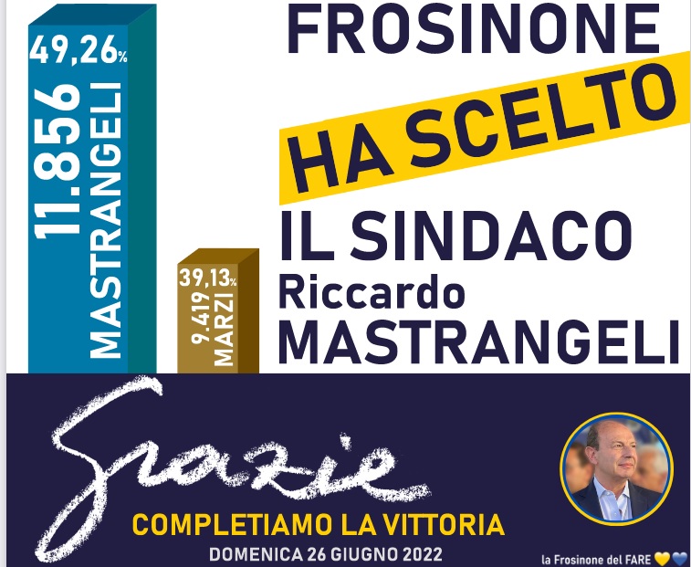 Dallo spoglio effettuato nella prima tornata elettorale di domenica 12 giugno, dai dati ufficiali è emerso come il candidato a sindaco per la città Riccardo Mastrangeli (49, 26% delle preferenze) abbia ottenuto 11.856 voti; le 7 liste a suo sostegno hanno totalizzato 11.376 voti. Riccardo Mastrangeli ha, dunque, ottenuto 480 voti in più dei partiti e delle civiche schierate, mentre il candidato a sindaco del Pd ha ottenuto soltanto 4 voti in più rispetto a quelli di coalizione. Ciò, dunque, a dimostrazione di come i cittadini di Frosinone abbiano chiaramente espresso la propria opinione in merito a chi sarà il futuro sindaco del capoluogo ciociaro, a partire dal 26 giugno.Seguimi su Facebook