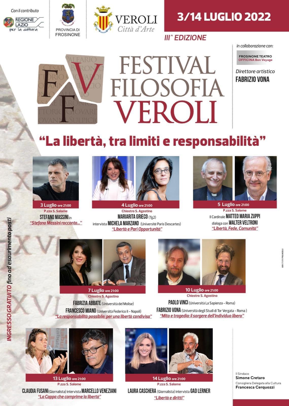 Dal 3 al 14 luglio 2022, nella suggestiva piazza Santa Salome e nel caratteristico chiostro di S. Agostino del centro storico di Veroli, saranno ben sette gli appuntamenti del festival della filosofia di quest’anno che caratterizzeranno gli incontri sul tema: “Libertà, Limiti, Responsabilità”.
