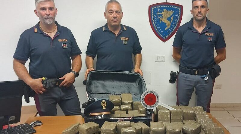 Viaggiavano sull’A1 con 30 chili di droga. Il maxi sequestro di sostanza stupefacente è stato messo a segno della Sottosezione Polizia Stradale di Frosinone. Gli agenti, nel pomeriggio di ieri, hanno fermato una Volkswagen Golf sull’autosole per un controllo. A bordo dell’auto viaggiava un uomo che da subito si è mostrato nervoso. Un atteggiamento che ha insospettito i poliziotti che hanno deciso di perquisire l’auto. Presto il motivo del nervosismo è stato spiegato: nel vano portabagagli l’uomo trasportava un trolley con 59 panetti per un totale di oltre 30 chilogrammi di hashish. La sostanza stupefacente, una volta consegnata dal ‘corriere della droga’ e immessa sul mercato, avrebbe fruttato più di 200.000 euro. Il fermato è stato arrestato con l’accusa di detenzione e traffico di sostanza stupefacente e posto a disposizione della locale A.G.