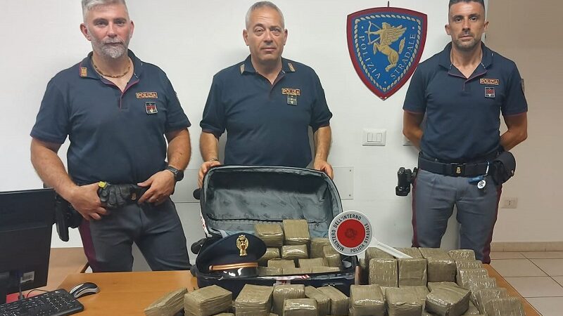 Viaggiavano sull’A1 con 30 chili di droga. Il maxi sequestro di sostanza stupefacente è stato messo a segno della Sottosezione Polizia Stradale di Frosinone. Gli agenti, nel pomeriggio di ieri, hanno fermato una Volkswagen Golf sull’autosole per un controllo. A bordo dell’auto viaggiava un uomo che da subito si è mostrato nervoso. Un atteggiamento che ha insospettito i poliziotti che hanno deciso di perquisire l’auto. Presto il motivo del nervosismo è stato spiegato: nel vano portabagagli l’uomo trasportava un trolley con 59 panetti per un totale di oltre 30 chilogrammi di hashish. La sostanza stupefacente, una volta consegnata dal ‘corriere della droga’ e immessa sul mercato, avrebbe fruttato più di 200.000 euro. Il fermato è stato arrestato con l’accusa di detenzione e traffico di sostanza stupefacente e posto a disposizione della locale A.G.