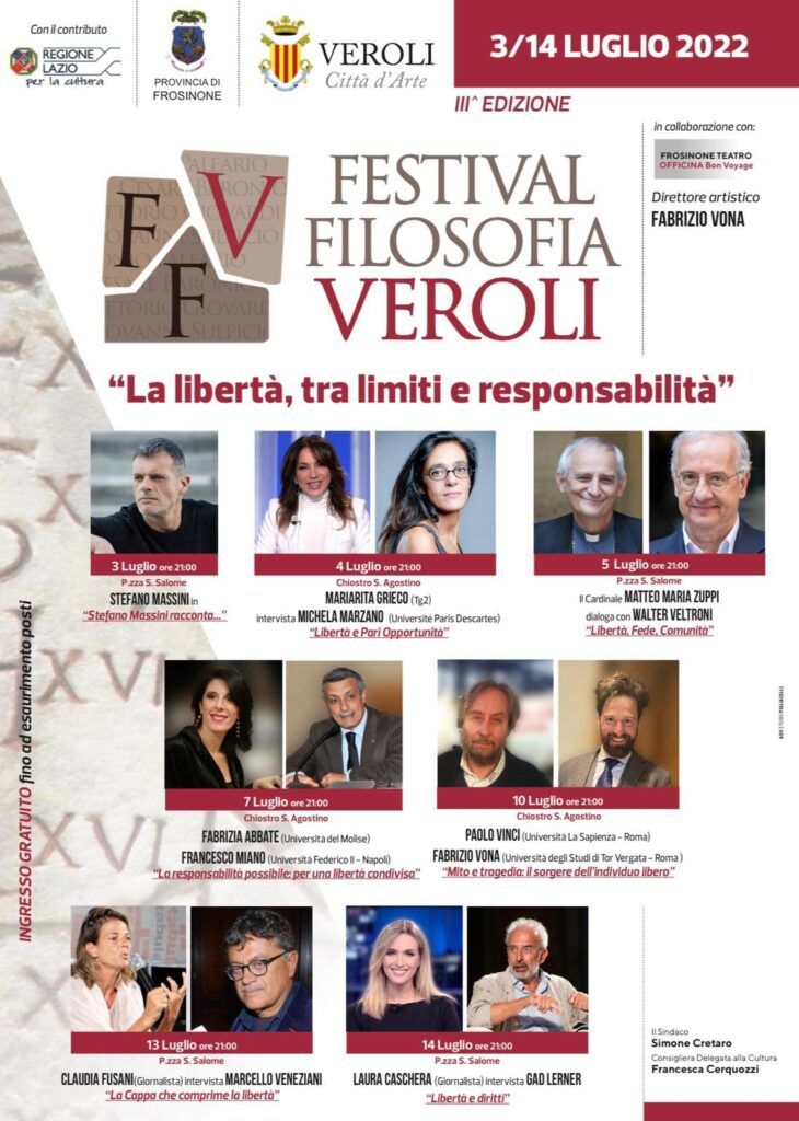 Dal 3 al 14 luglio 2022, nella suggestiva piazza Santa Salome e nel caratteristico chiostro di S. Agostino del centro storico di Veroli, saranno ben sette gli appuntamenti del festival della filosofia di quest’anno che caratterizzeranno gli incontri sul tema: “Libertà, Limiti, Responsabilità”. L’organizzazione dell’evento culturale – nato nel 2020 in piena emergenza epidemiologica da Covid e che staandando oltre ogni più lusinghiera aspettativa per gli illustri relatori e per la straordinaria partecipazione del pubblico, specie di quello giovanile – è del Comune di Veroli, con la direzione artistica di Fabrizio Vona.
