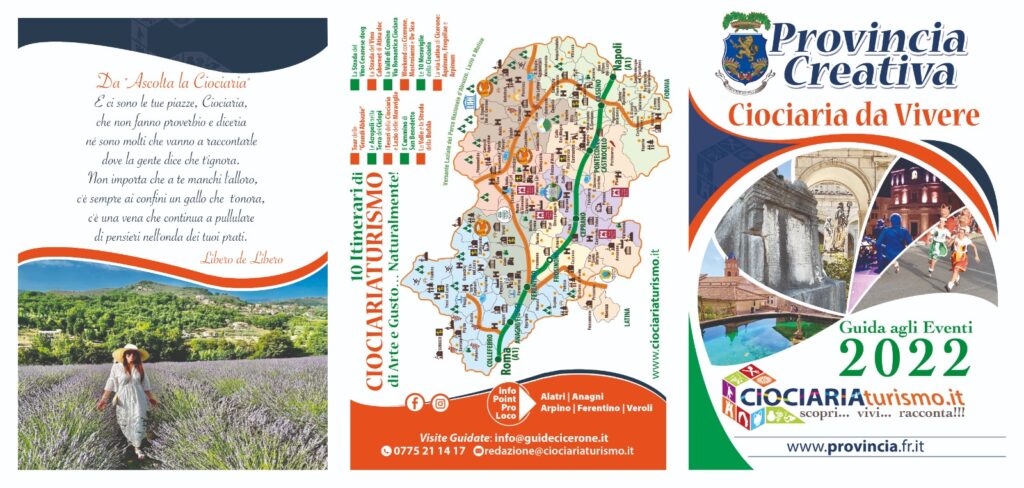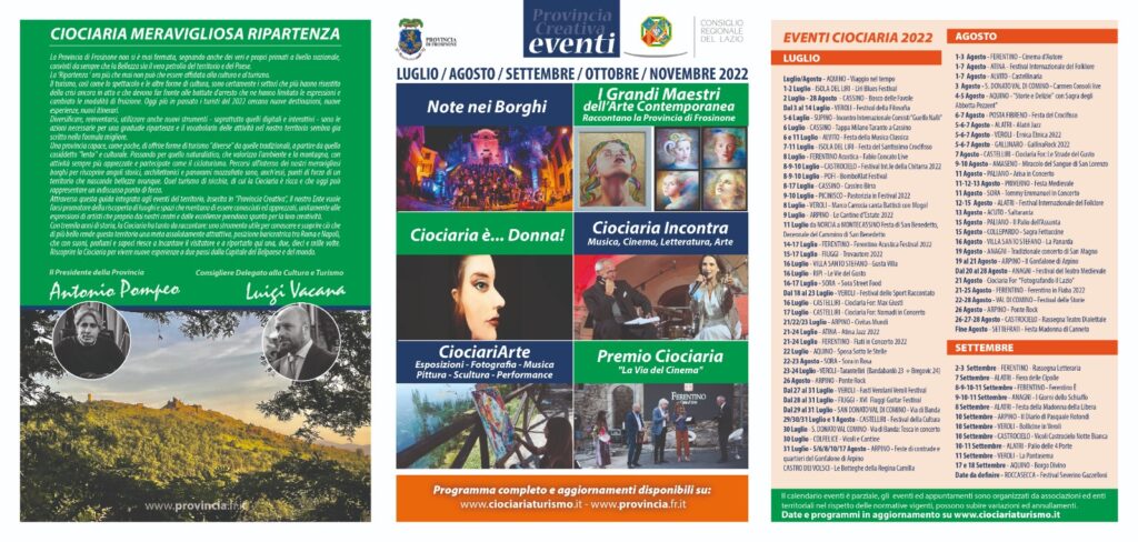 Un cartellone unico redatto in collaborazione con “Ciociaria Turismo”, dove fanno bella mostra di se, accanto alle manifestazioni tradizionali e storiche presenti sul territorio, anche gli appuntamenti prodotti in esclusiva dalla Provincia. È il caso di “Note dei Borghi”, “la Ciociaria Incontra”, “i Grandi Maestri dell’Arte contemporanea raccontano la Provincia di Frosinone”, “CiociariArte” e molto altro ancora. Un raccoglitore preziosissimo dunque di tutto ciò che in questi mesi la Ciociaria è in grado di esprimere in ambito culturale e ricreativo. Un lavoro certosino e capillare, reso possibile dalla collaborazione con le Amministrazioni Comunali, le Associazioni e le strutture più qualificate nel settore, prima fra tutte “Ciociaria Turismo”.