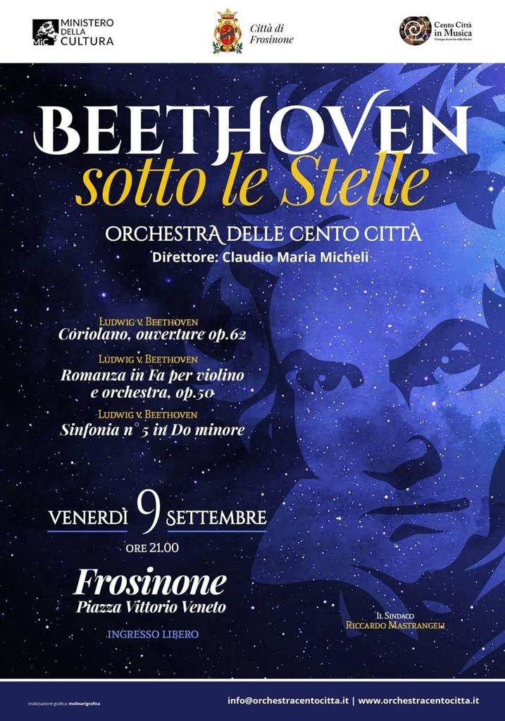 “L’Orchestra delle Cento Città ha voluto onorarci scegliendo il nostro capoluogo per inaugurare la tournée dedicata al grande compositore tedesco, che comprenderà altre sette date. Proseguirà, poi, con la Sinfonia “Dal Nuovo Mondo” di Antonín Dvořák – ha dichiarato il sindaco di Frosinone, Riccardo Mastrangeli – Il concerto di venerdì, nel centro storico, costituisce un evento di grande spessore, realizzato da un ensemble di grande qualità che riunisce, al proprio interno, professionisti di lungo corso e giovani musicisti che interpreteranno, con bravura e originalità, un programma ricco di intensità ed emozioni”. Questo il programma della serata: “Coriolano”, ouverture op. 62; “Romanza in Fa per violino e orchestra”, op. 50; “Sinfonia n. 5” in Do minore.